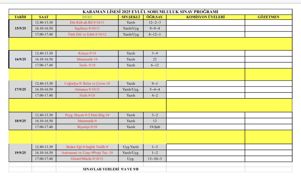 2025 Eylül Sorumluluk Sınavları Programı